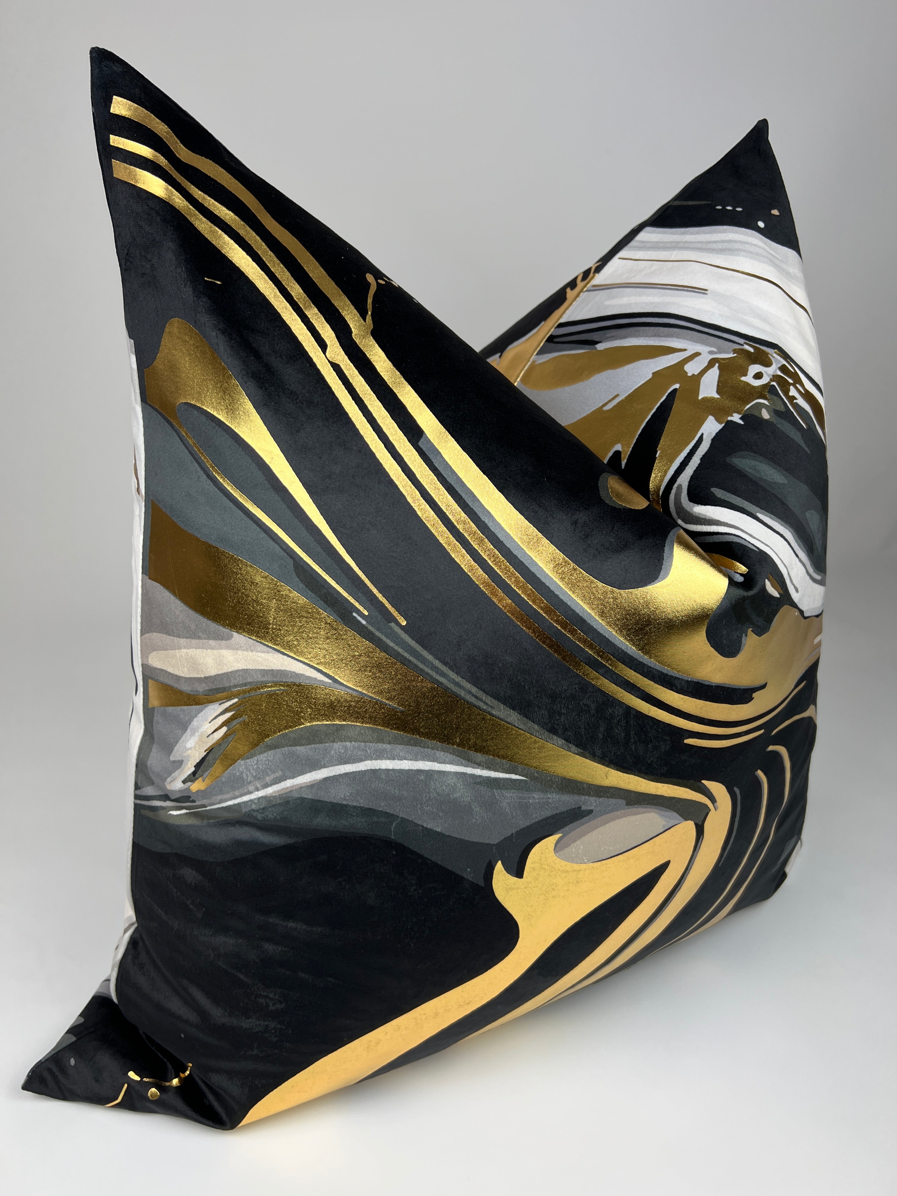 Wendy's New Exclusive Design! Size: 24" x 24" Fabric: Gray, black, white, metallic gold velvet  Zipper: Invisible Cover Only: Pillow Insert not included. We recommend using a 26" x 26" feather/down insert to achieve a designer look Shipping Time: 5-7 days Pre-orders: 30 Day Return Policy: All items in new...