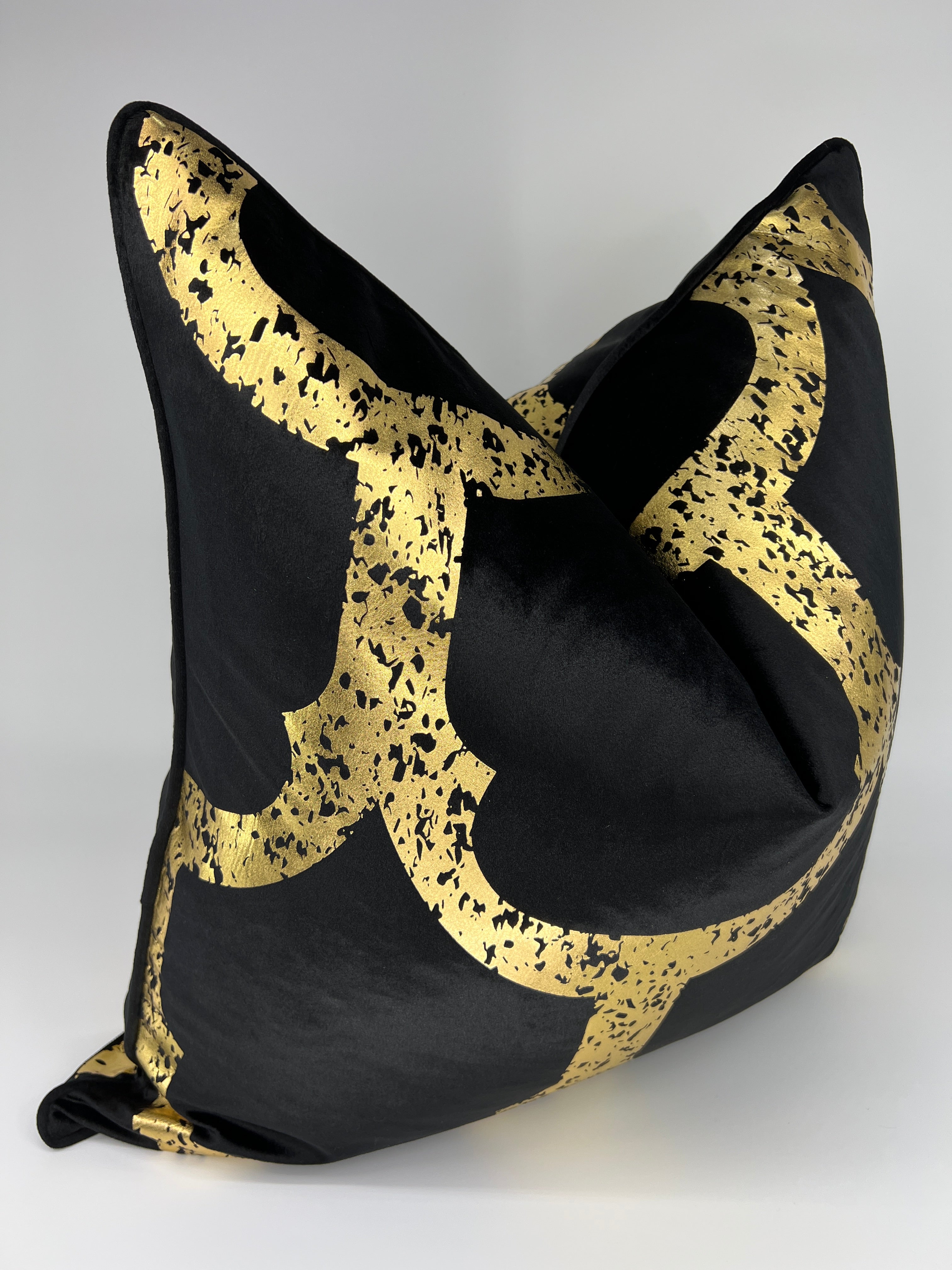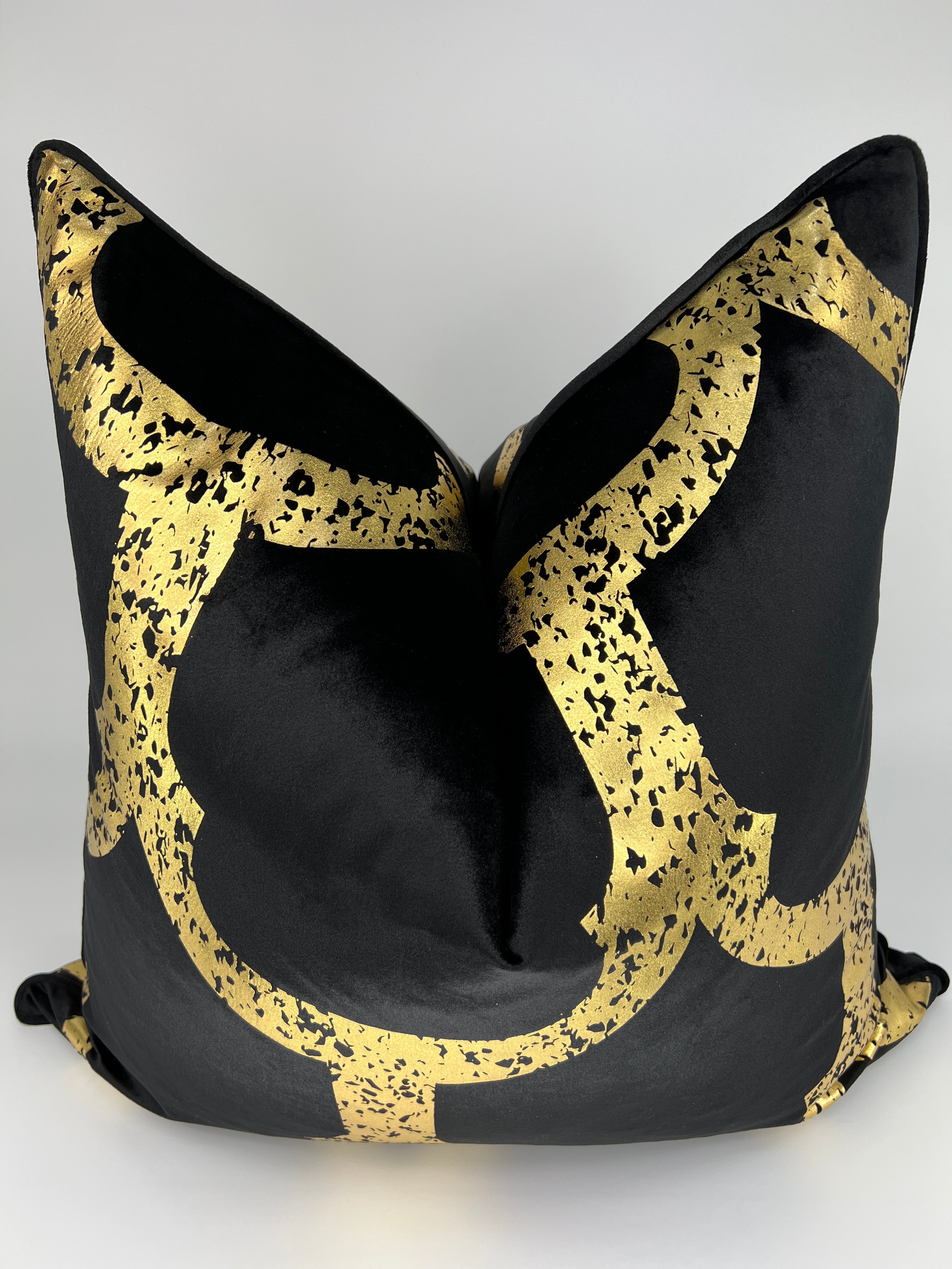 Size: 24" x 24" Fabric: Black Velvet & Metallic Gold on both sides Zipper: Invisible Cover Only: Pillow Insert not included. We recommend using a 26" x 26" feather/down insert to achieve a designer look FREE SHIPPING NO TAX Shipping Time: 5-7 days 30 Day Return Policy: All items in...