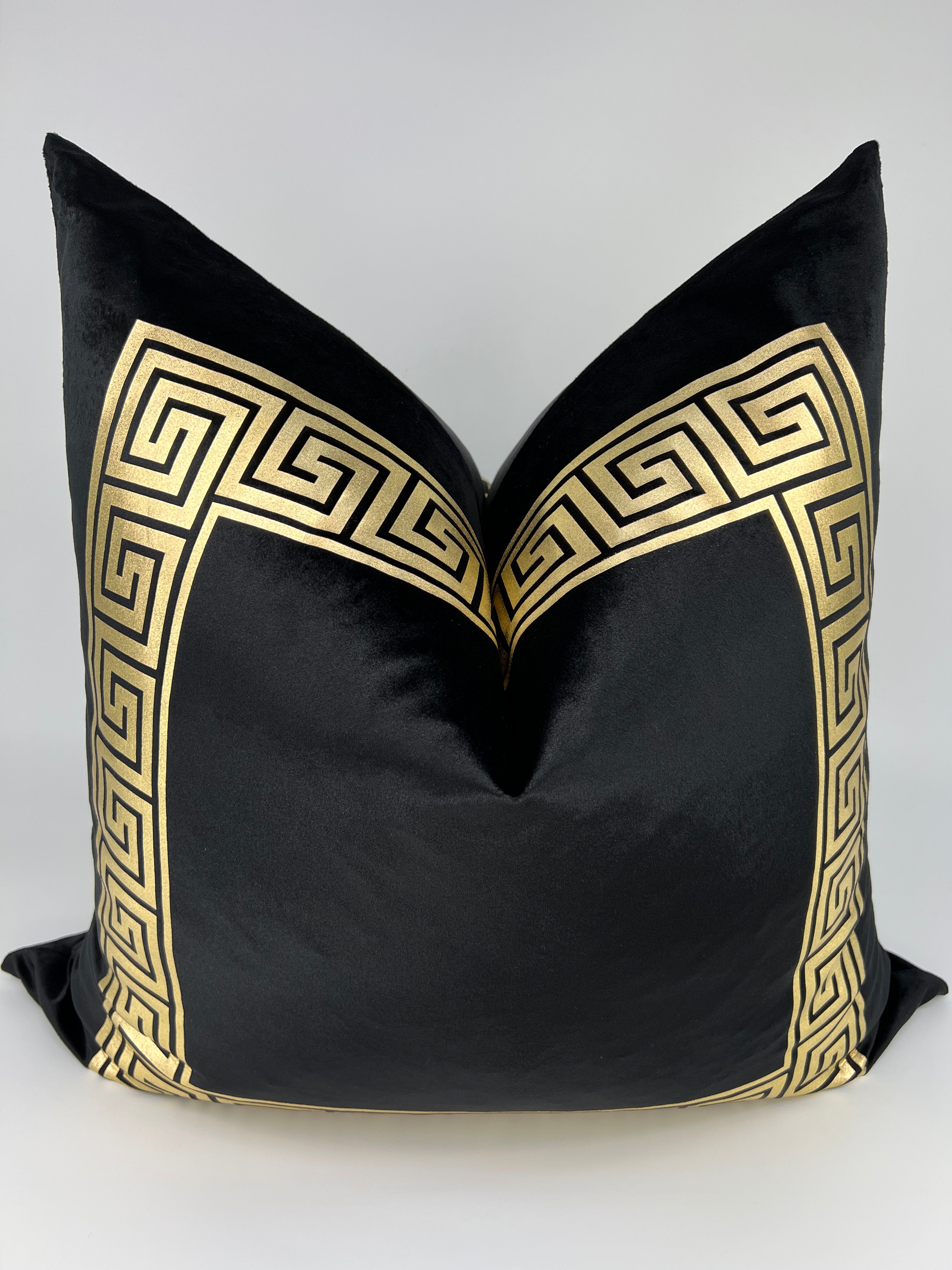 Size: 24" x 24" Fabric: Black Velvet & Metallic Gold on both sides Zipper: Invisible Cover Only: Pillow Insert not included. We recommend using a 26" x 26" feather/down insert to achieve a designer look FREE SHIPPING NO TAX Shipping Time: 5-7 days 30 Day Return Policy: All items in...