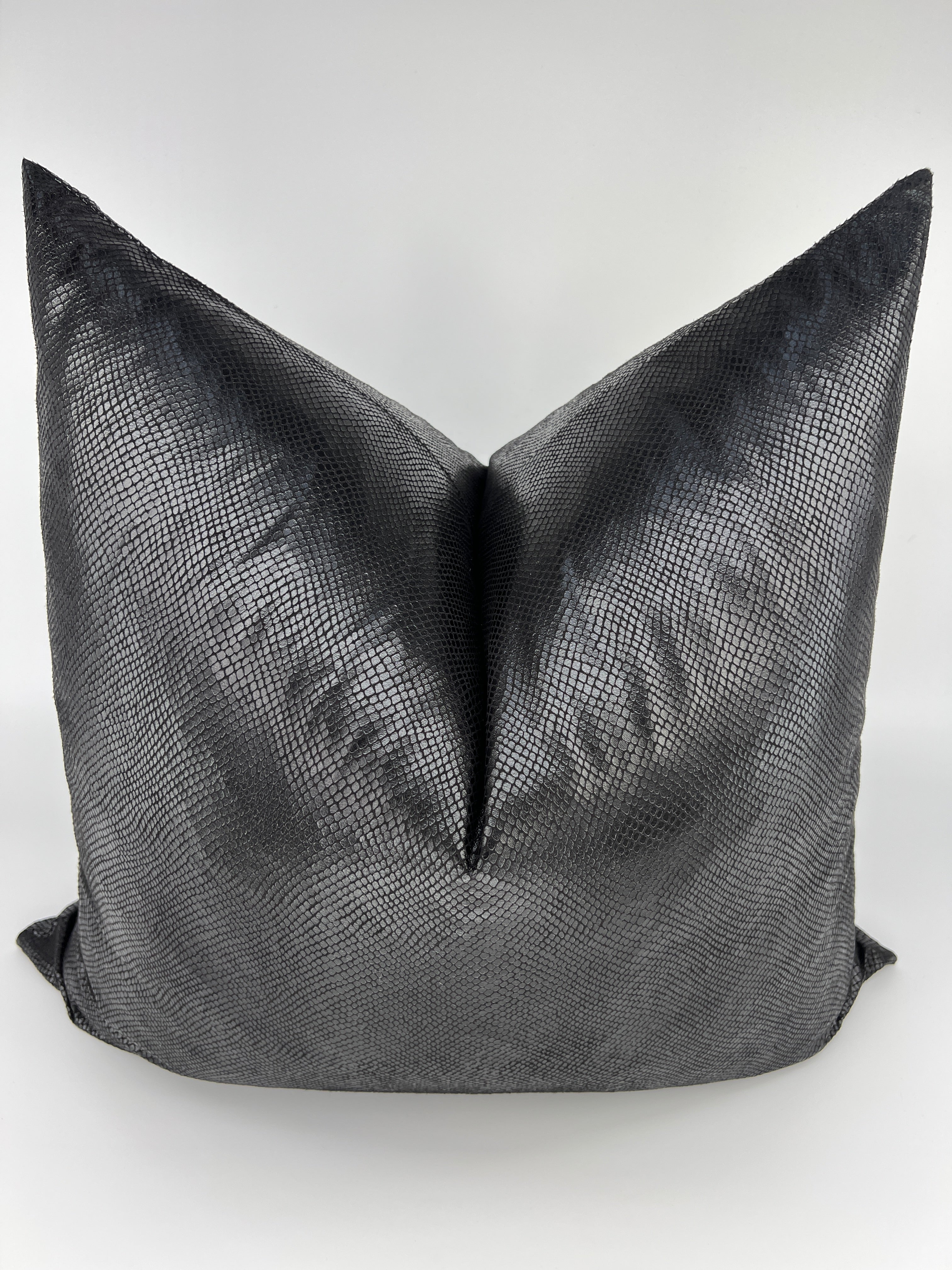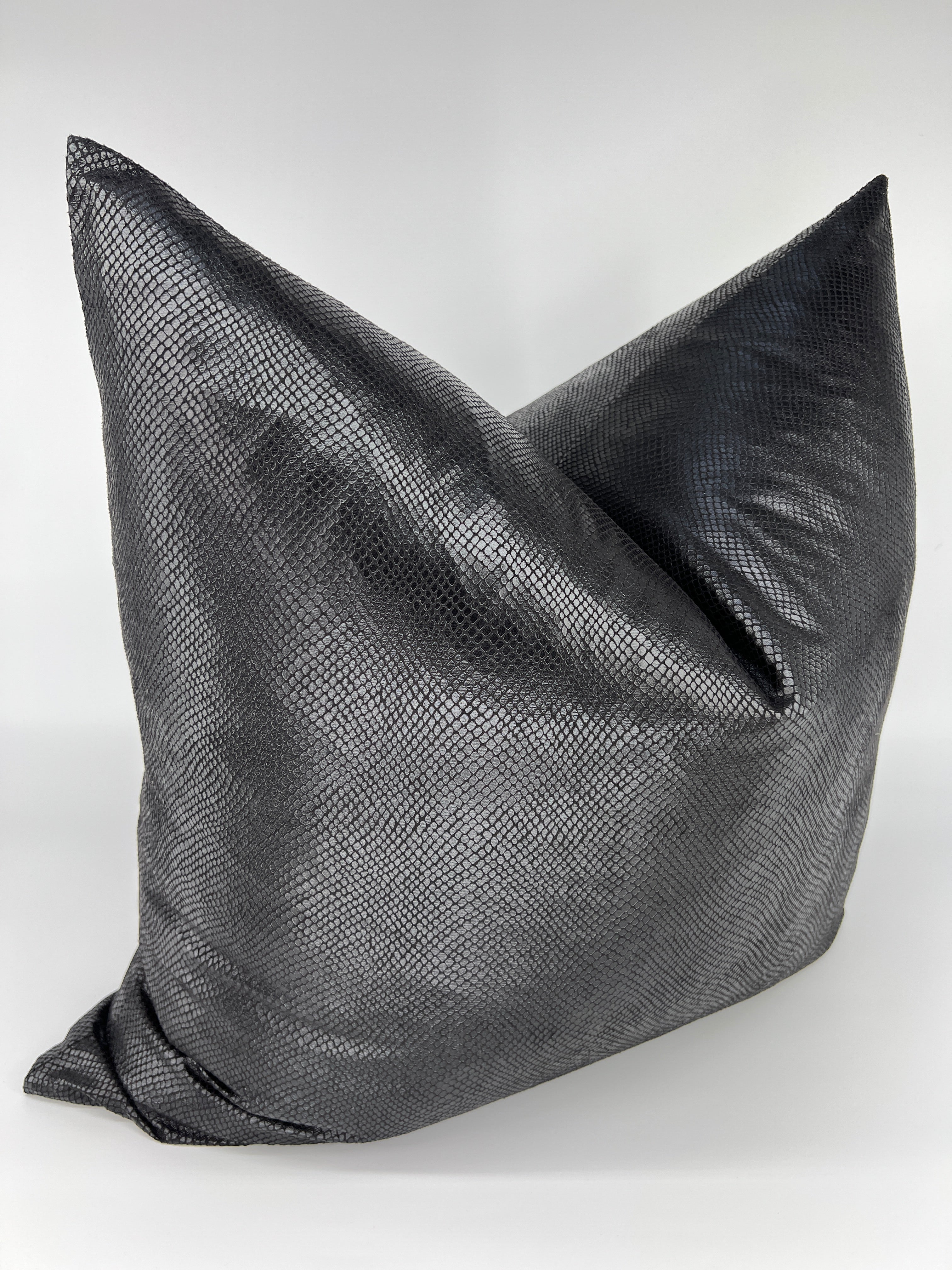 Size: 24" x 24" Fabric: Black Glamorous Shimmery Faux Snake Skin on both sides  Zipper: Invisible Cover Only: Pillow Insert not included. We recommend using a 26" x 26" feather/down insert to achieve a designer look FREE SHIPPING NO TAX Shipping Time: 5-7 days 30 Day Return Policy: All items...